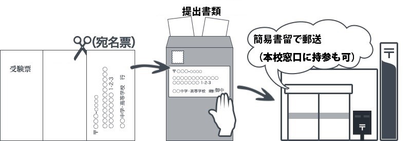出願に必要な提出書類は、A4サイズ封筒(角2封筒)にいれて、受験票と一緒に印刷される「宛名票」を貼り、「簡易書留」で期日までに郵送するか、あるいは本校事務室に持参してください。