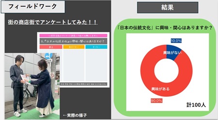 高2の時、彼は「日本の伝統文化を後世に残していくためには」と題した探究活動を進めていた。「日本人自身は、日本文化のことをどう捉えているか」について老若男女100名への街頭アンケートをはじめ、オンラインを通じた世界の若者との交流の機会を利用して、日本文化についての意識調査もおこなった。そこで、「日本人自身の、日本文化に対する関心は低いのでは?」との彼の仮説に反し、結果は9割が「関心がある」と回答したのだという。彼のこの驚きが、探究活動のひとつの動機になっていった。