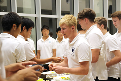 試合後はカフェテリアでレセプションパーティが行われました。司会を務めたのは女子テニス部の生徒。浴衣を着て登場し、すべて英語で進行しました。また、当日誕生日だったCCBのメンバーにサプライズで「ハッピーバースデー」を歌ってプレゼントを渡したり、スマートフォンで記念撮影をするなど、和気藹々とした雰囲気で交流することができました。