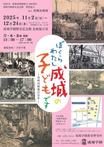 成城学園歴史記念館では、これを記念して特別展示「ぼくら わたし 成城の子どもです —成城幼稚園の百年—」を開催します。初代主事として幼稚園の礎を築き、現在でも歌い継がれる園歌「成城 成城」の作者でもある幼児教育・リトミック研究者小林宗作の紹介や、歴代の幼稚園舎、古い写真など、資料の数々とともに成城幼稚園の歴史を振り返ります。