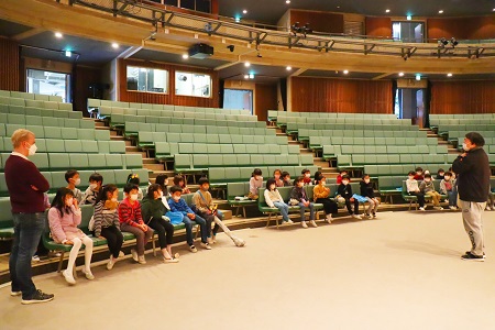 見学中のグループはロブ先生と一緒に観客役となり演技をジャッジ。声が届いている時はマル、聞こえない時はバツでステージの子どもたちに伝えます