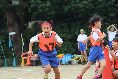クライマックスは大玉リレー。幼稚園児を6年生がサポートして玉を転がし、次に初等学校の児童は頭の上で玉を運びます。年中組から6年生までが一緒になって懸命にグラウンドを駆け抜けました。