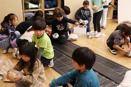 床一面に広がる紙には、プロジェクターで炎や植物が映し出され、児童は思い思いに絵を描きました