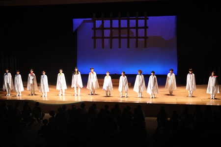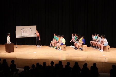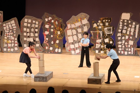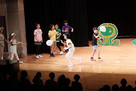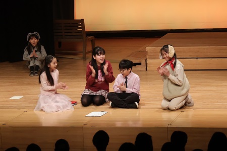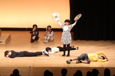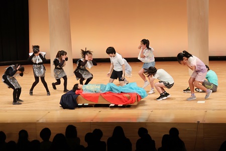 5年生への進級を控えている櫟組の子どもたち。3つのグループに分かれて、ある惑星の異なる国へワープし、48時間以内に地球へと戻ってこられたら合格できるという進級試験に挑みます。それぞれのグループは現地の警察官や妖精とゲームで対戦したり、寝ている王様を助けるために奮闘したりしながらなんとかミッションをクリアし、地球へ帰還。元気な櫟組の子どもたちの普段の姿が垣間見えるような、自然で生き生きとした演技と、観客を巻き込みながら盛り上げるアドリブ劇でこの日の劇の会のトップバッターを華やかに飾りました。