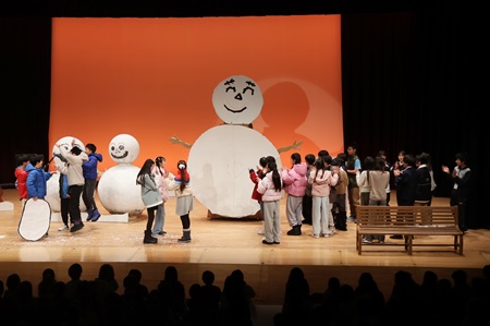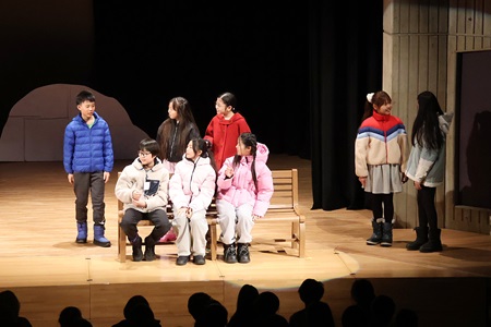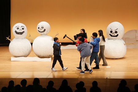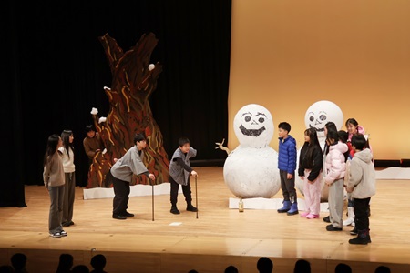 過疎化に悩む白樺村でのお話。「生きた雪だるまと宿泊体験ができる!」という案内で、白樺村の宿泊体験に参加した都会の子どもたちは、村の人たちが話す“生きている雪だるま”の様々な経験談に疑心暗鬼。「宿題を手伝ってくれた」「鬼ごっこをして遊んでくれた」などにわかには信じられない逸話を話す村の子どもたち。じつは、雪だるまを観光の目玉にして人集めをしようとする村長さんと村人たちの作り話でした。人離れによる村の衰退に悩む村人たちの嘆きを聞き、雪だるま目当てで集まっていた都会の子どもたち、YouTuber、外国人観光客がみんな再び村に遊びに来ることを約束します。そして記念に大きな雪だるまを作ると驚きの光景が!白樺組が初等学校最後の劇の会で、さすが6年生と感じさせるすばらしい演技で観客を魅了しました。どのシーンも、劇を楽しみながら演じている子どもたちの姿が印象的でした。