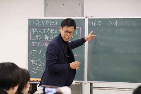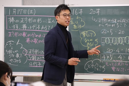 数学科授業Ⅰ 授業者:工藤尋大教諭(学級閉鎖に伴い、参加大学生の方に児童役をお願いしました)