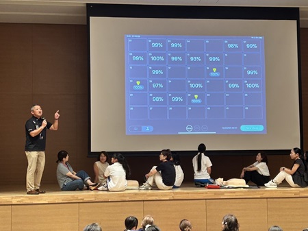 今回初めて島田先生からBLS講習会を始める前に命の大切さをより感じて欲しいということで、大泉洋主演の映画「ディア・ファミリー」の映像を一部紹介していただきました。その後、ダミー人形を使ってグループ毎にAEDの使用方法や心臓マッサージを参加者全員が実習しました。各グループにライフセービング部の生徒たちが付いて、丁寧かつ的確にアドバイスをしてくれたおかげで、初めてでも大切なポイントを確認することができました。また、参加者の結果の数値は100%(失敗なし)の方が続出。殆どの参加者が高得点で、会場が拍手に包まれました。