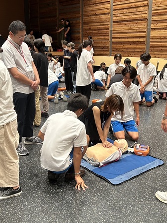 BLSとは、Basic Life Supportの略で、心停止や呼吸停止に陥ってしまった人に対し、救急車が到着するまでに行う一次救命処置のことです。成城学園では継続的にFirst Responderを増やすことを目的とした講習会を2014年より開催しており、これまでに延べ20,000人以上の方々が受講いただいております。今回も保健体育科の島田先生(日本ライフセービング協会、学校教育推進委員会委員)を講師に迎え、高校ライフセービング部の生徒たちにもご協力いただきました。