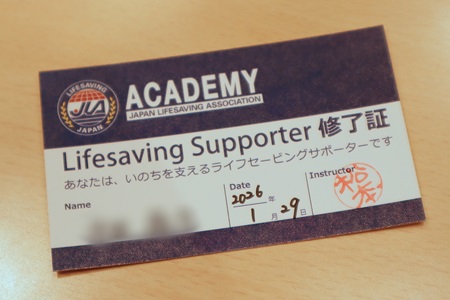 研修の受講生に授与される「Lifesaving Supporter修了証」とともに、日本ライフセービング協会が制作した「『ドラえもん』と親子で学ぶ水辺の安全に関するリーフレット」が配られました