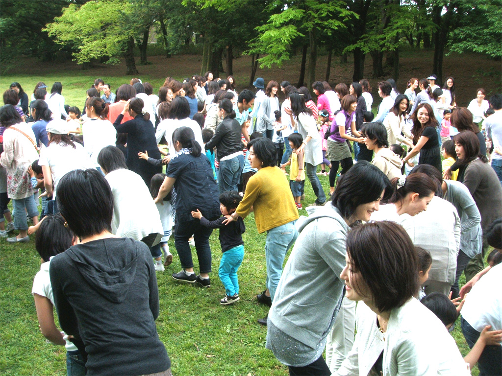先回りして待機していた年中年長のお母様方に迎えられて到着。最初の作業はクラスごとの写真撮影です。そして、全学年集合してご家族も含めて全部で200人を超える人数のダンス。壮観です。次は親子ゲームとお母様たちのゲーム。「母親のほうが楽しんじゃった」とうれしそうにお話しするお母様もいました。
