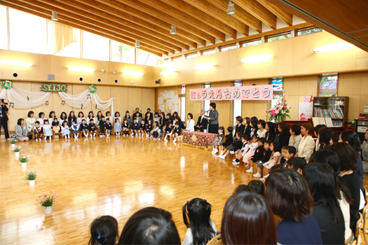 新入園児は新しい生活にちょっと緊張しているようにも見えましたが、保護者の方に手を引かれホールに入場する姿を温かな拍手で迎えました。なのはな組とれんげ組の男女20名ずつ40名が担任より一人ひとり名前を呼ばれ「はい」と返事する声も可愛らしく、在園児の歓迎の歌声や輪つなぎのネックレスのプレゼント、油井学園長のお祝の言葉をいただき微笑ましい雰囲気の中、終了しました。