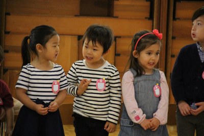 「こいのぼり」の歌を全員で元気に歌った後は、年長・年中・年少さんがそれぞれ歌とダンスを披露しました。全員で「たけのこ体操」と「アブラハムには7人の子」を踊った時は大盛り上がりでした。途中で年少さんが泣いてしまった時、優しく頭を撫でていた年長さんの姿はとても頼もしかったです。