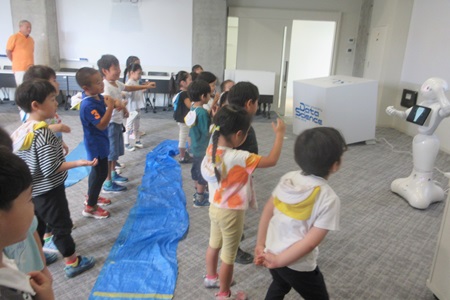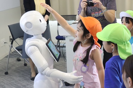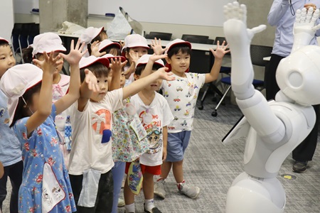9月26日(金)に年少組、9月29日(月)に年中組、9月30日(火)に年長組が、大学9号館のデータサイエンススクエアにてソフトバンクロボティクスの人型ロボット「Pepper」との触れ合い体験をしました。大学データサイエンス教育研究センターの森由美特任教授が、子どもたちがロボットについて知り、楽しく学ぶことができるプログラムをたくさん用意してくれました。