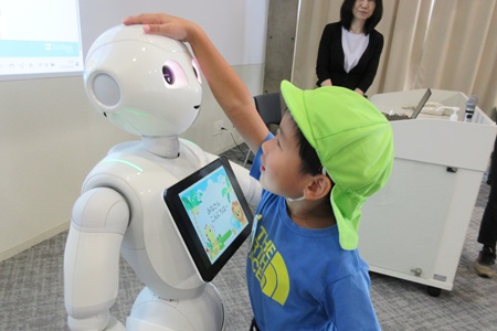 最初は、一人ずつPepperに触れてみるプログラム「さわってタッチ」。「Pepperは人に触られたのが分かる場所がいくつかあります。どこだか分かるかな?」。森先生が問いかけると「頭!」「手!」「お腹かな」と、子どもたちから次々に声があがりました。正解は「頭」「手の甲」「タブレット」です。早速順番にPepperに触れてみると、言葉を発したり、コミカルな動きをしたりして子どもたちを楽しませてくれました。最初は少し緊張した様子だった子も、Pepperの反応を見て嬉しそうに笑顔を見せていました。「Pepperは歩けるの?」「字は読める?」「何歳なの?」。Pepperに興味津々の子どもたちから質問があがると、森先生が丁寧に答えてくれました。その後も、Pepperが園児一人一人の名前を呼んで、子どもたちが返事をしたり、Pepperによる紙芝居を聞いて楽しい時間を過ごしました。