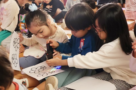 「みんな描けたかな?描けた絵はお家の人にプレゼントしよう」。今回の実験教室を通して、子どもたちは、身近なクレヨンや絵の具の色の混じり方と、光の色の混ざり方には違いがあること、そして光は赤・青・黄色の三原色が混ざると白く見えるという、新たな発見をしました。